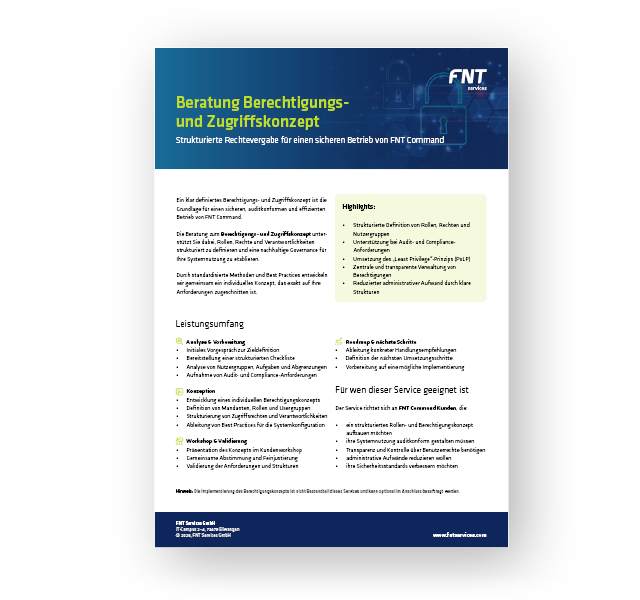 Die Beratung zum Berechtigungs- und Zugriffskonzept unterstützt Sie dabei, Rollen, Rechte und Verantwortlichkeiten strukturiert zu definieren und eine nachhaltige Governance für Ihre Nutzung von FNT Command zu etablieren.